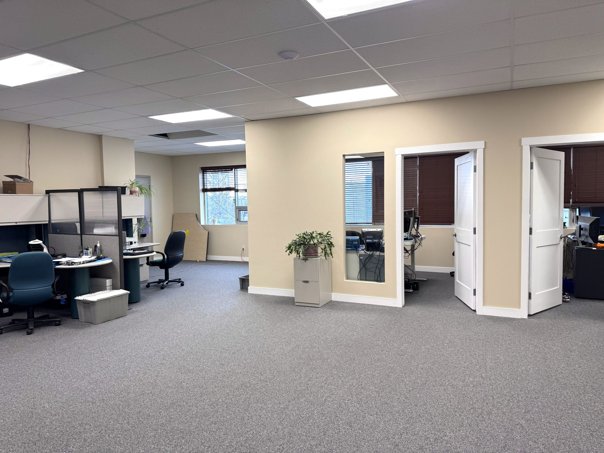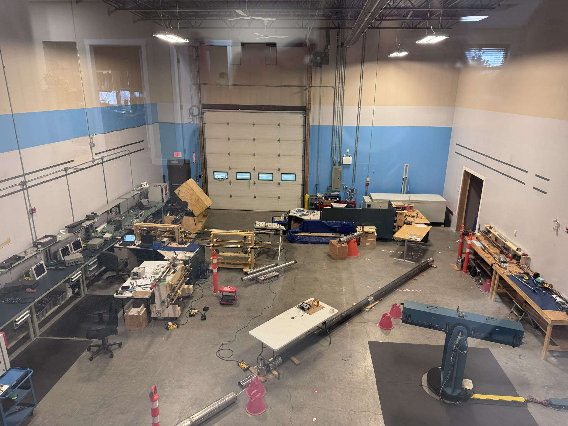 The bay features radiant heat, 23’ clear ceilings, 200 AMP power service, and an automated 12’×14’ overhead door, allowing easy access for freight or large equipment.